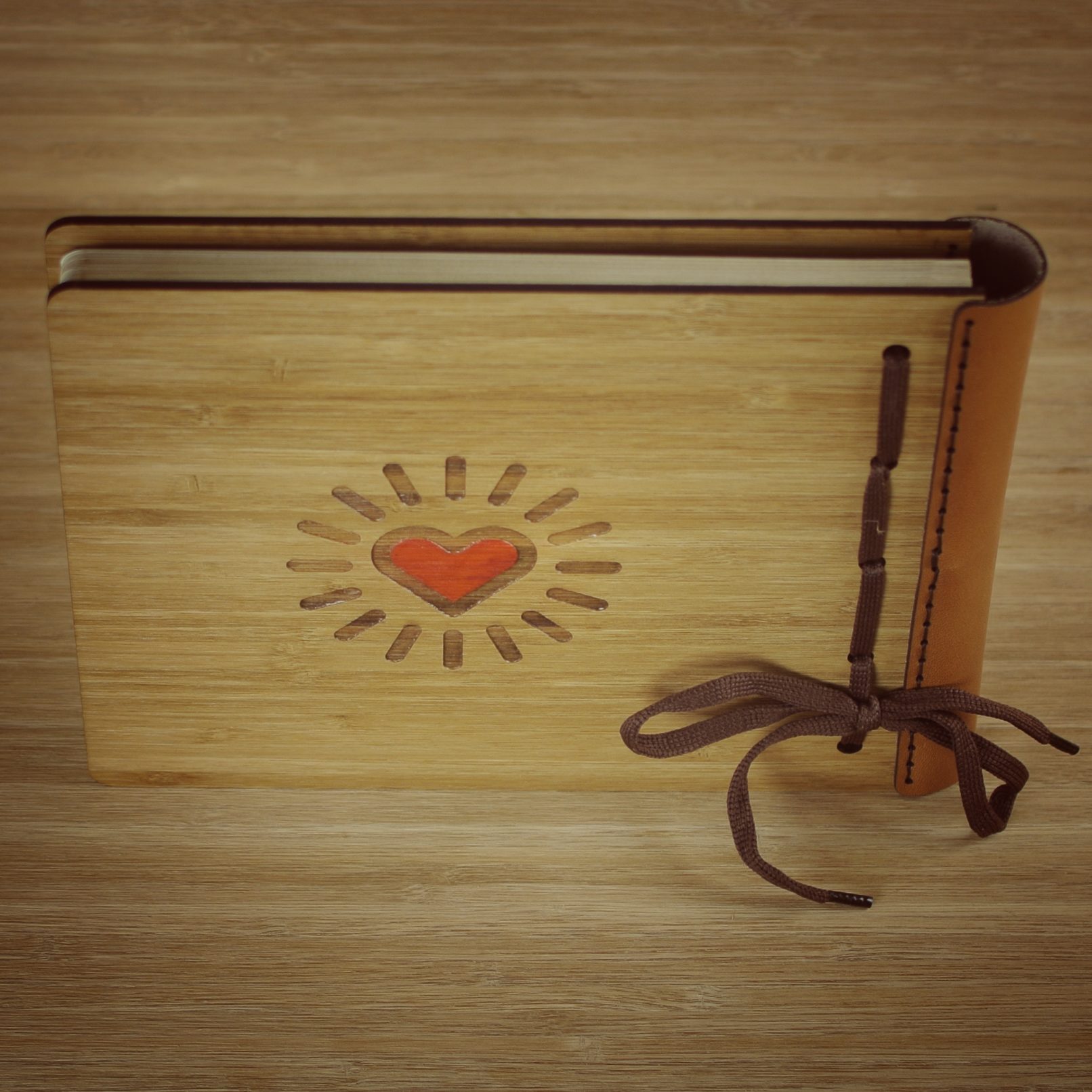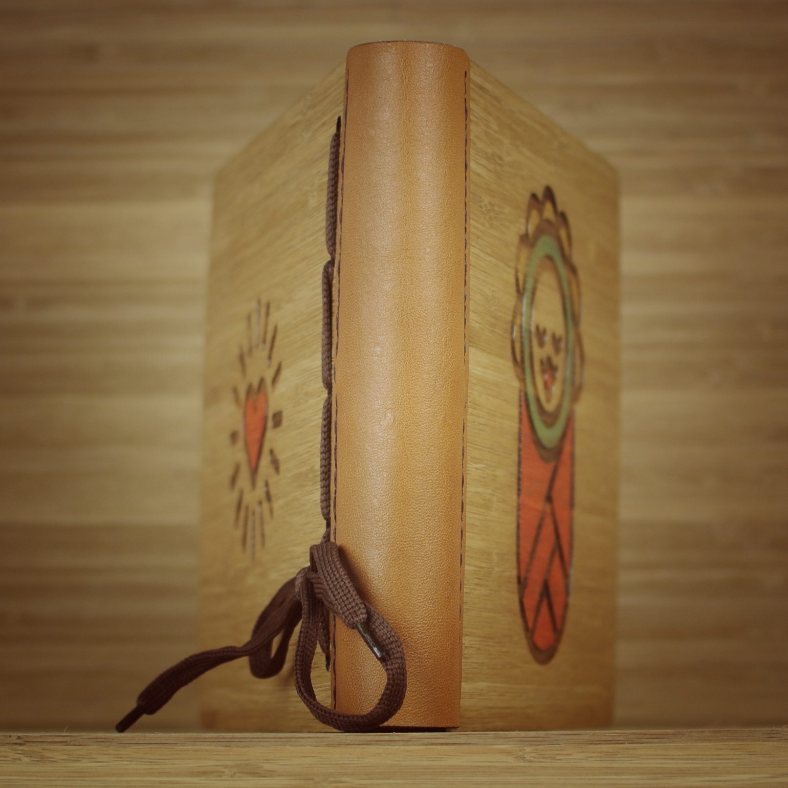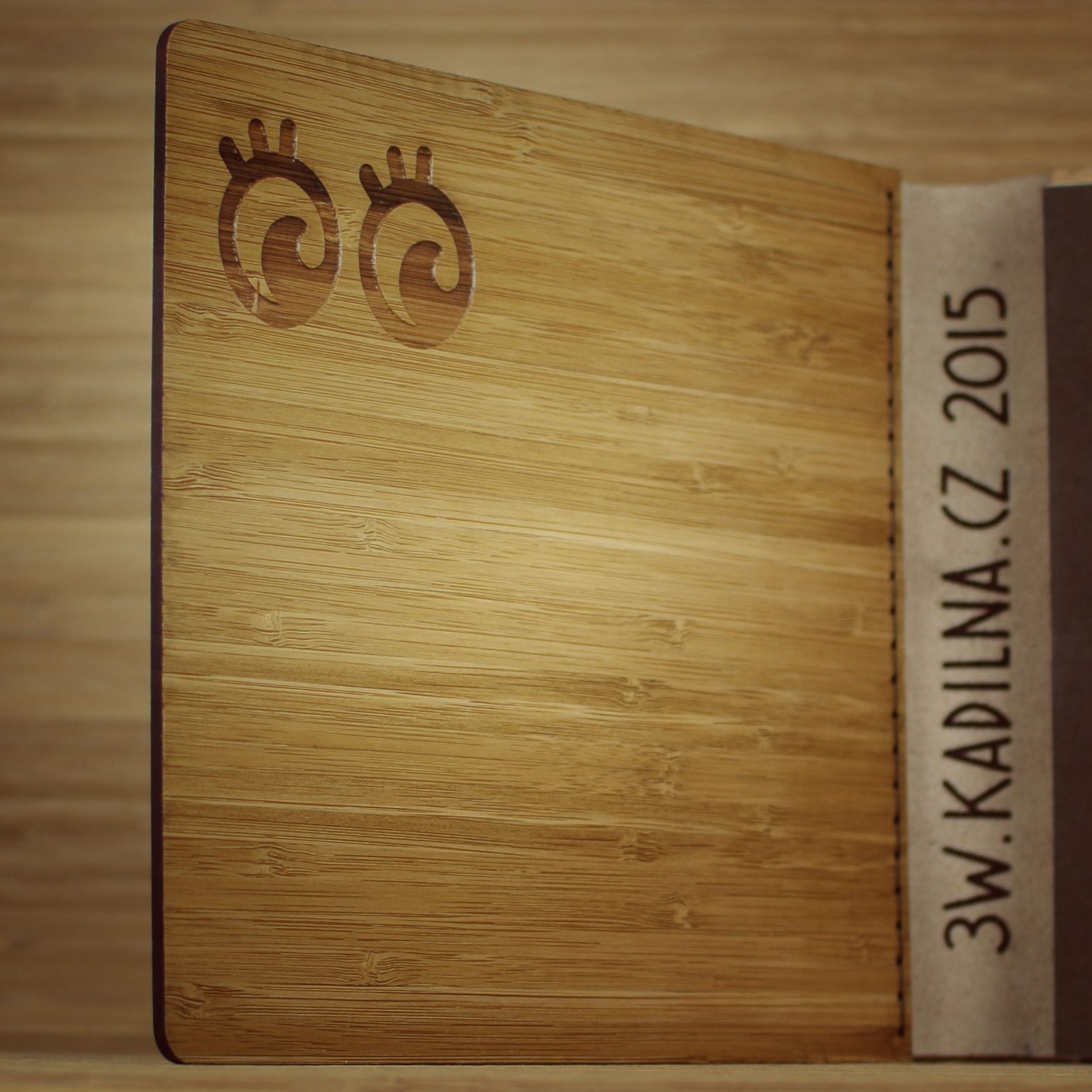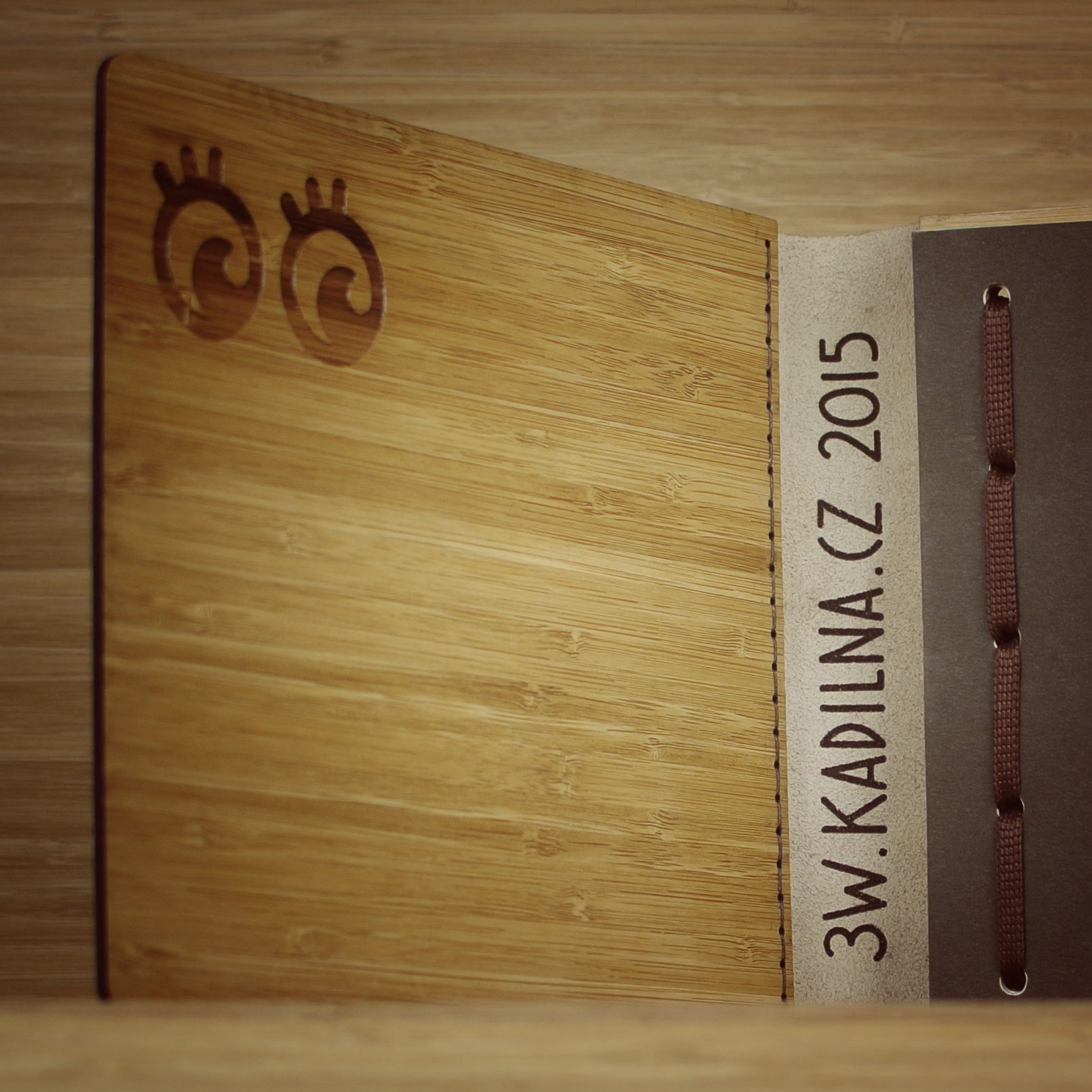 Laserovaná překližka z bambusového dřeva, gravírovaná grafika, kolorovaná, lakovaná. Vložené grafické papíry, vázané tkaničkou.