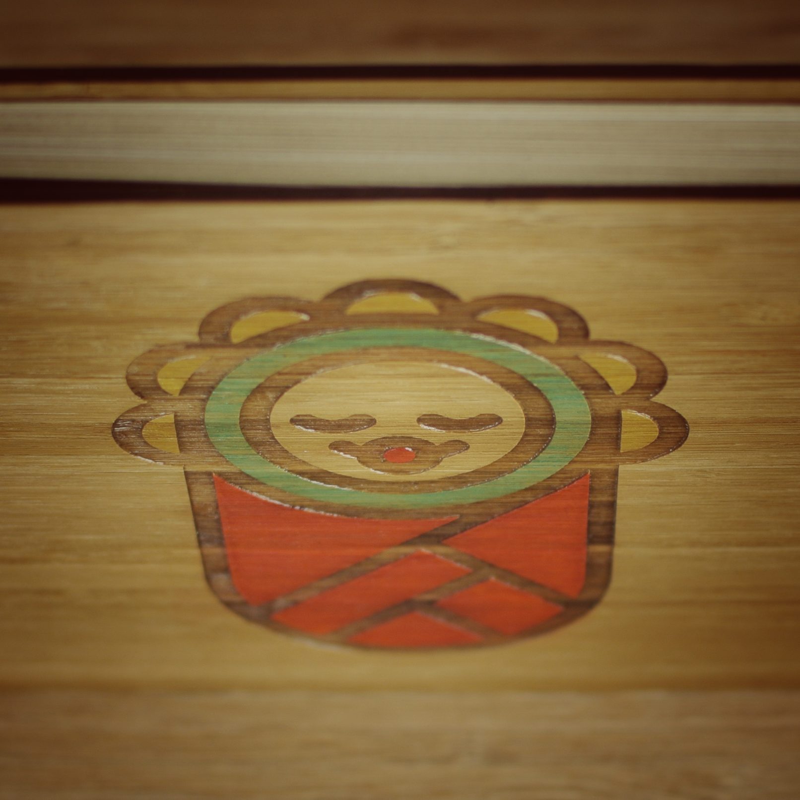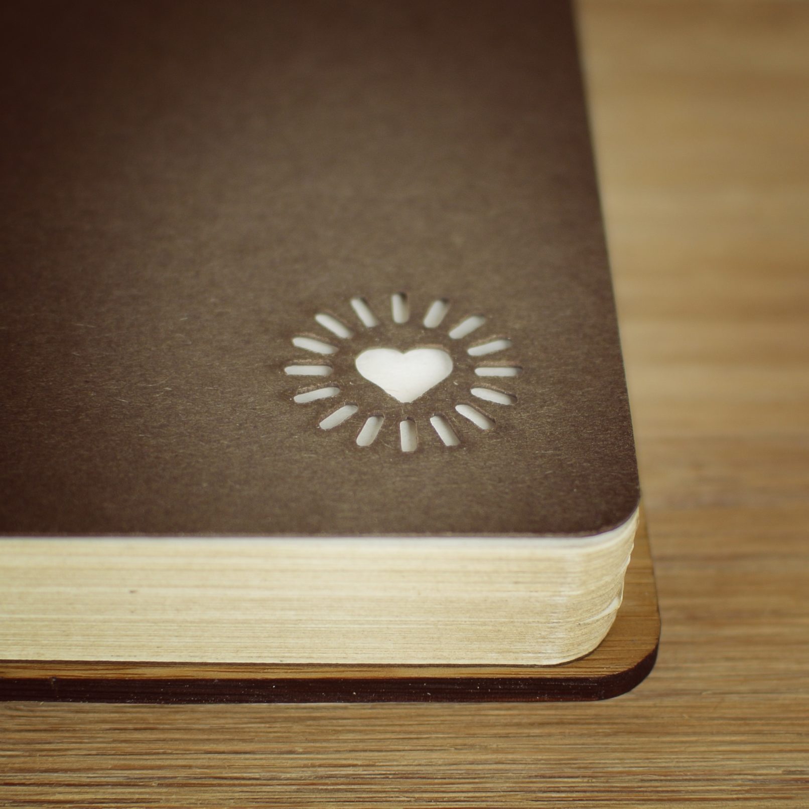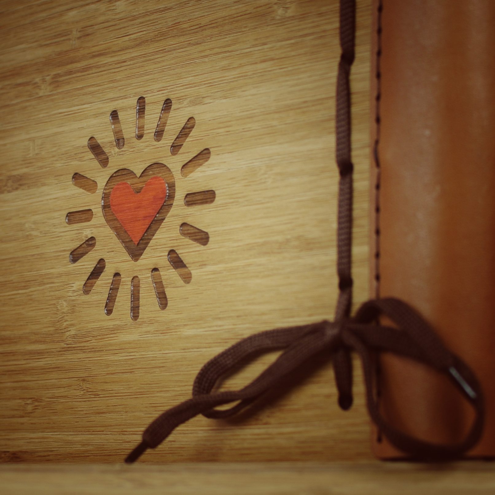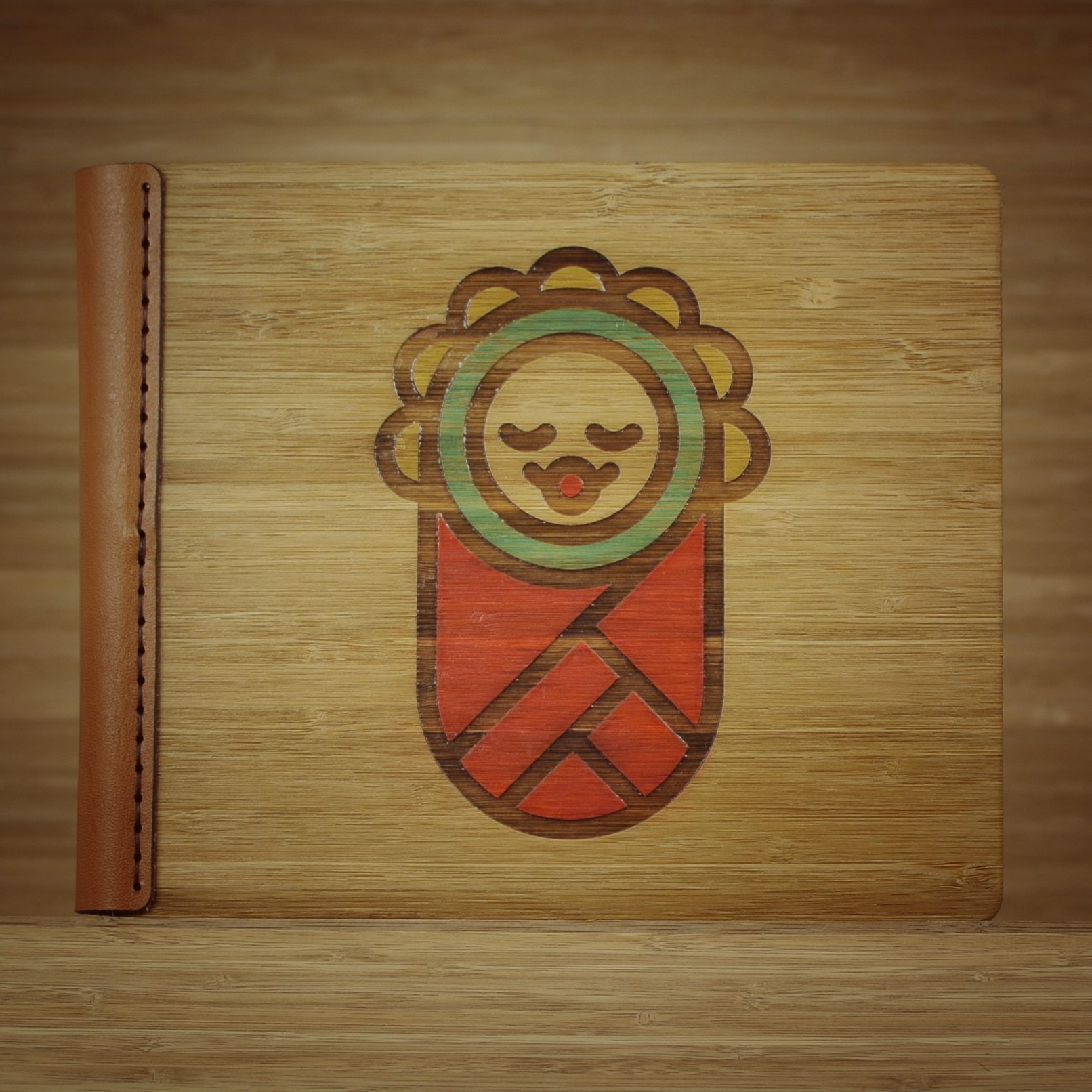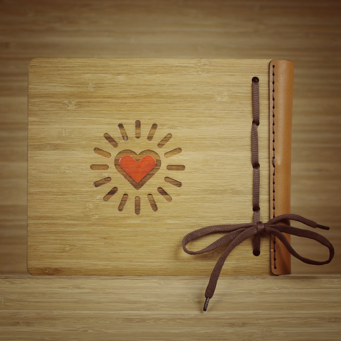 Laserovaná překližka z bambusového dřeva, gravírovaná grafika, kolorovaná, lakovaná. Vložené grafické papíry, vázané tkaničkou.