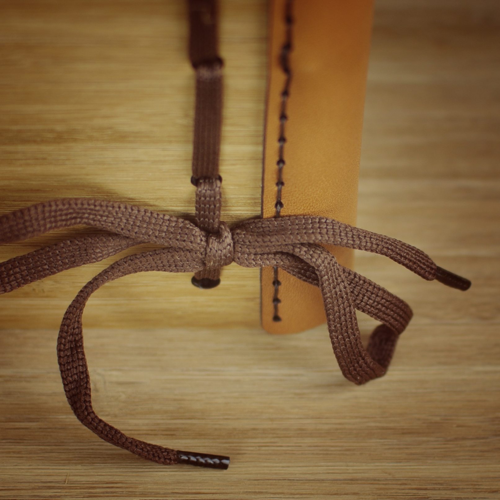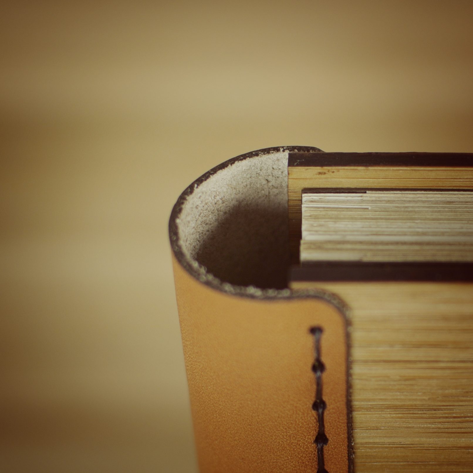 Hřbet z hovězí kůže s gravírovaným nápisem na vnitřní straně.