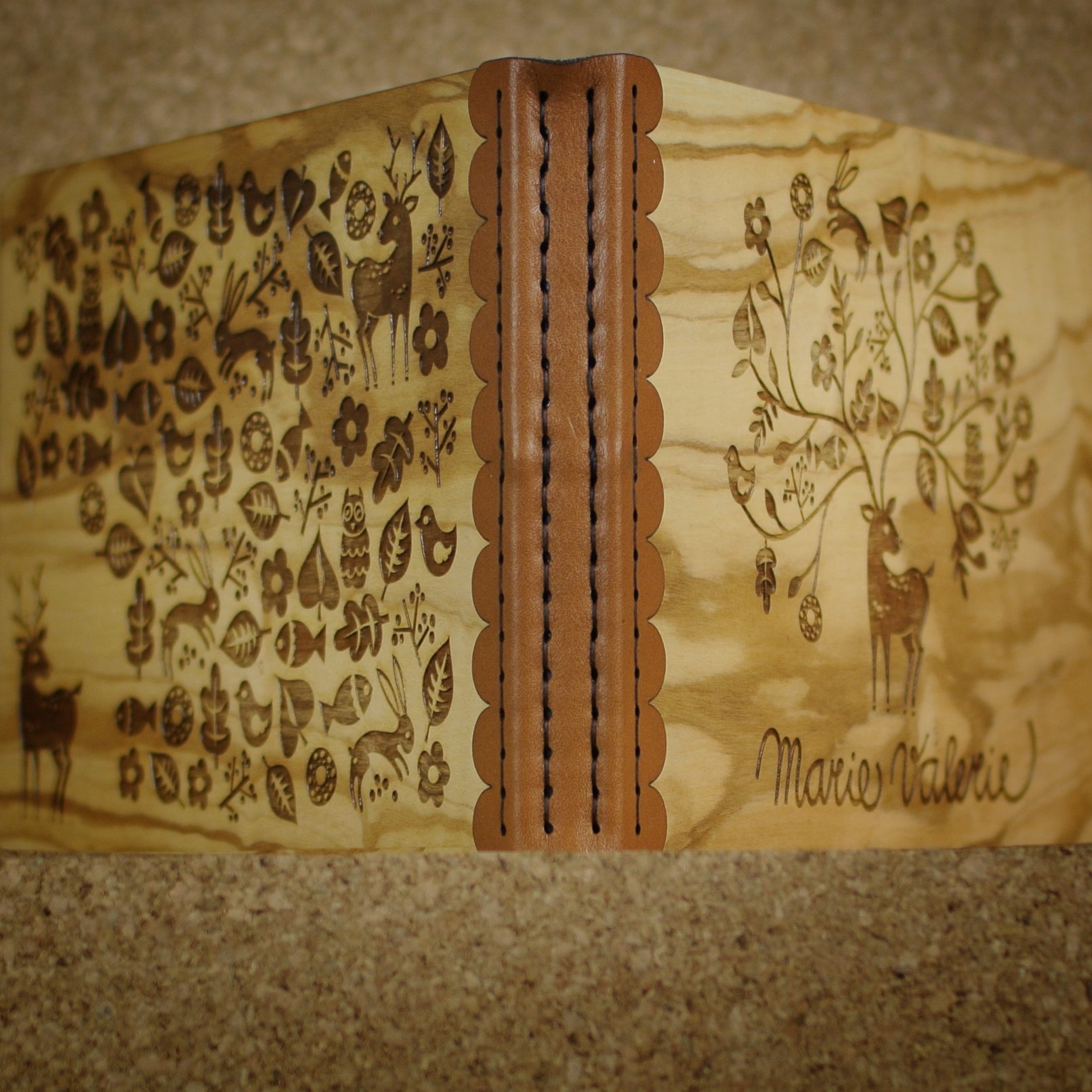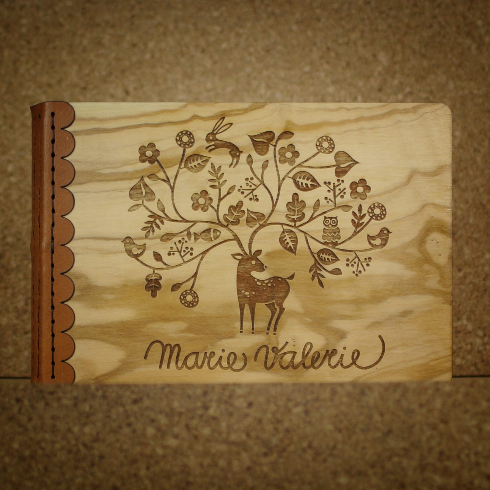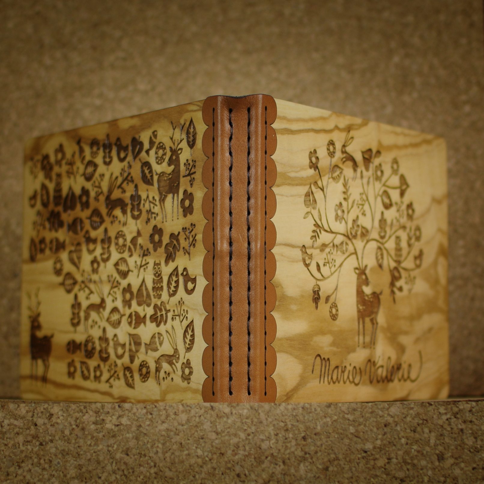 Ilustrace dětského fotoalba, gravírované do překližky z olivového dřeva.