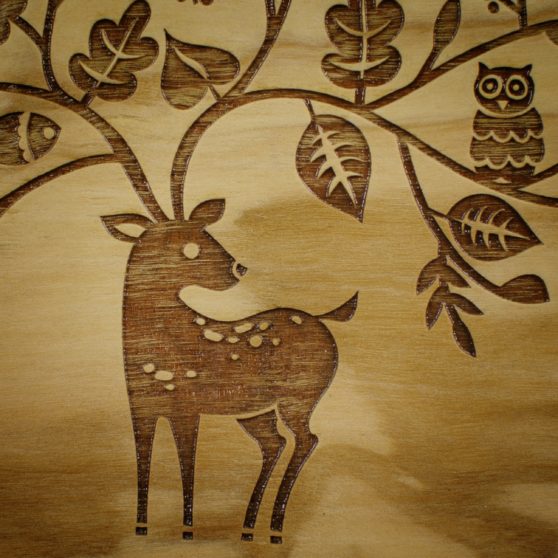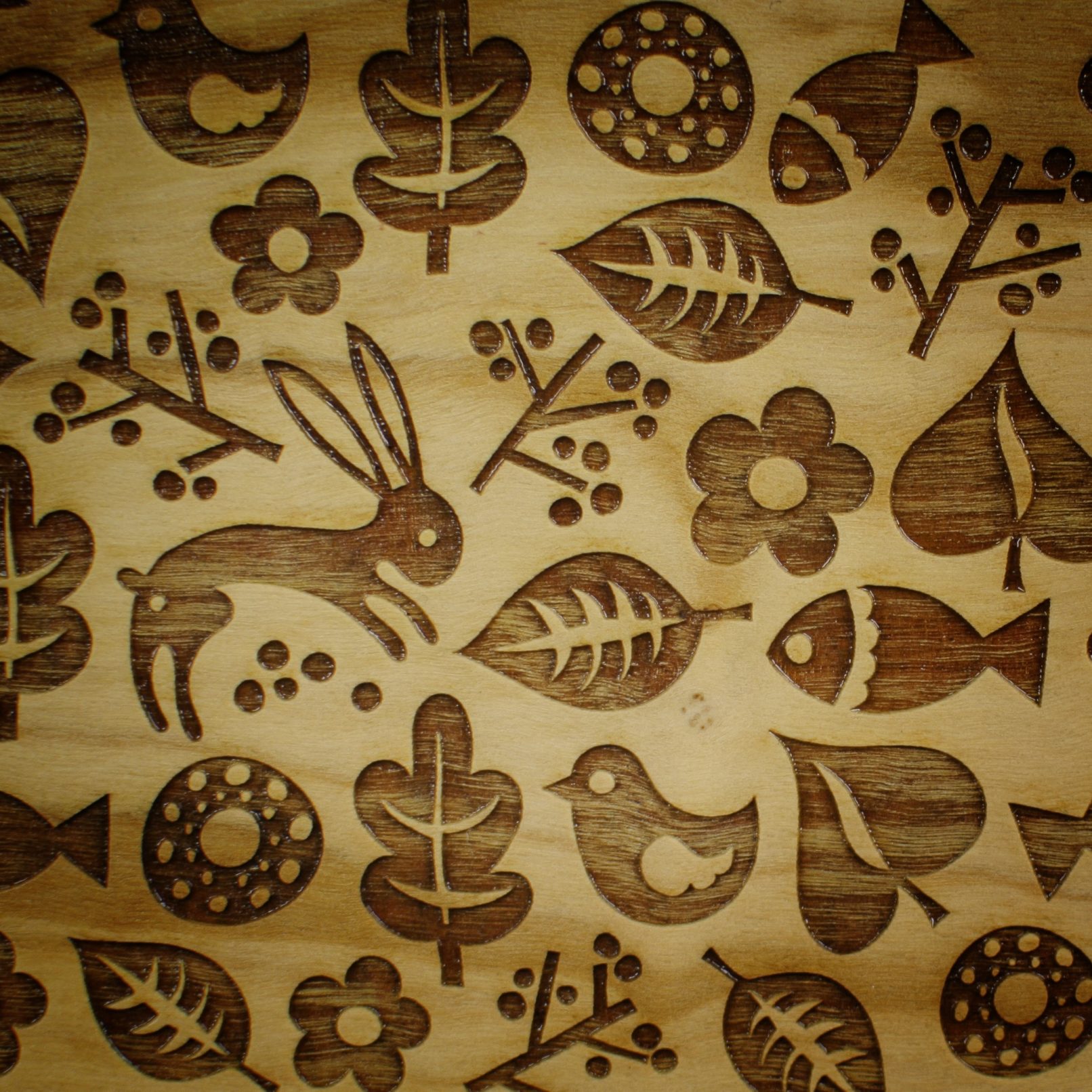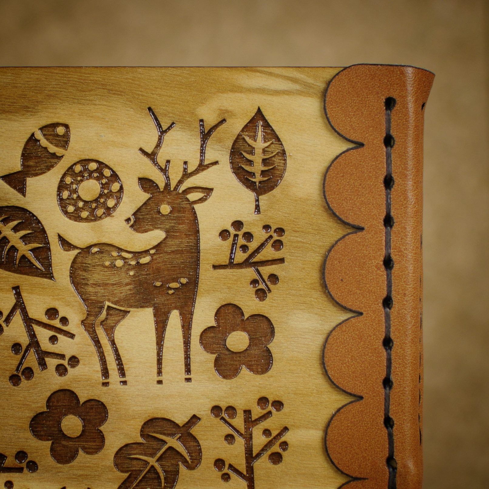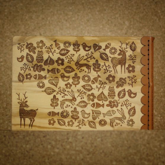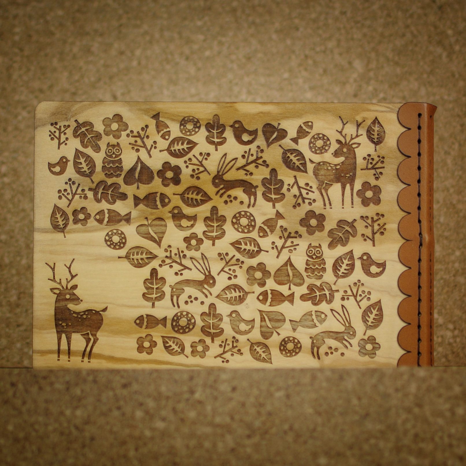 Ilustrace dětského fotoalba, gravírované do překližky z olivového dřeva.