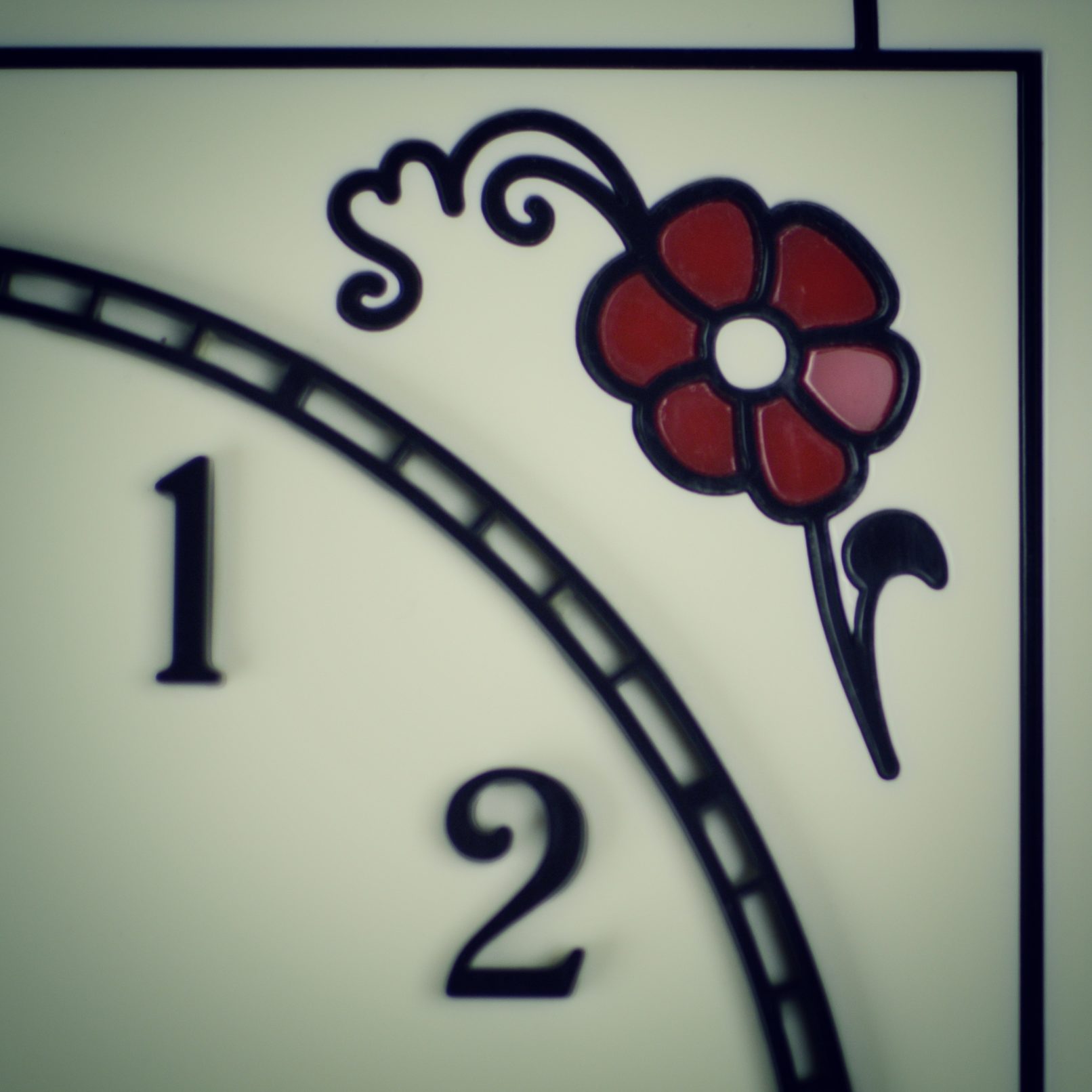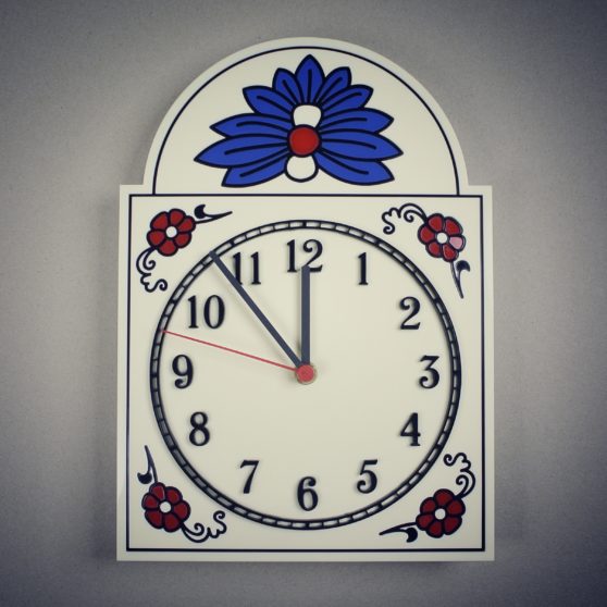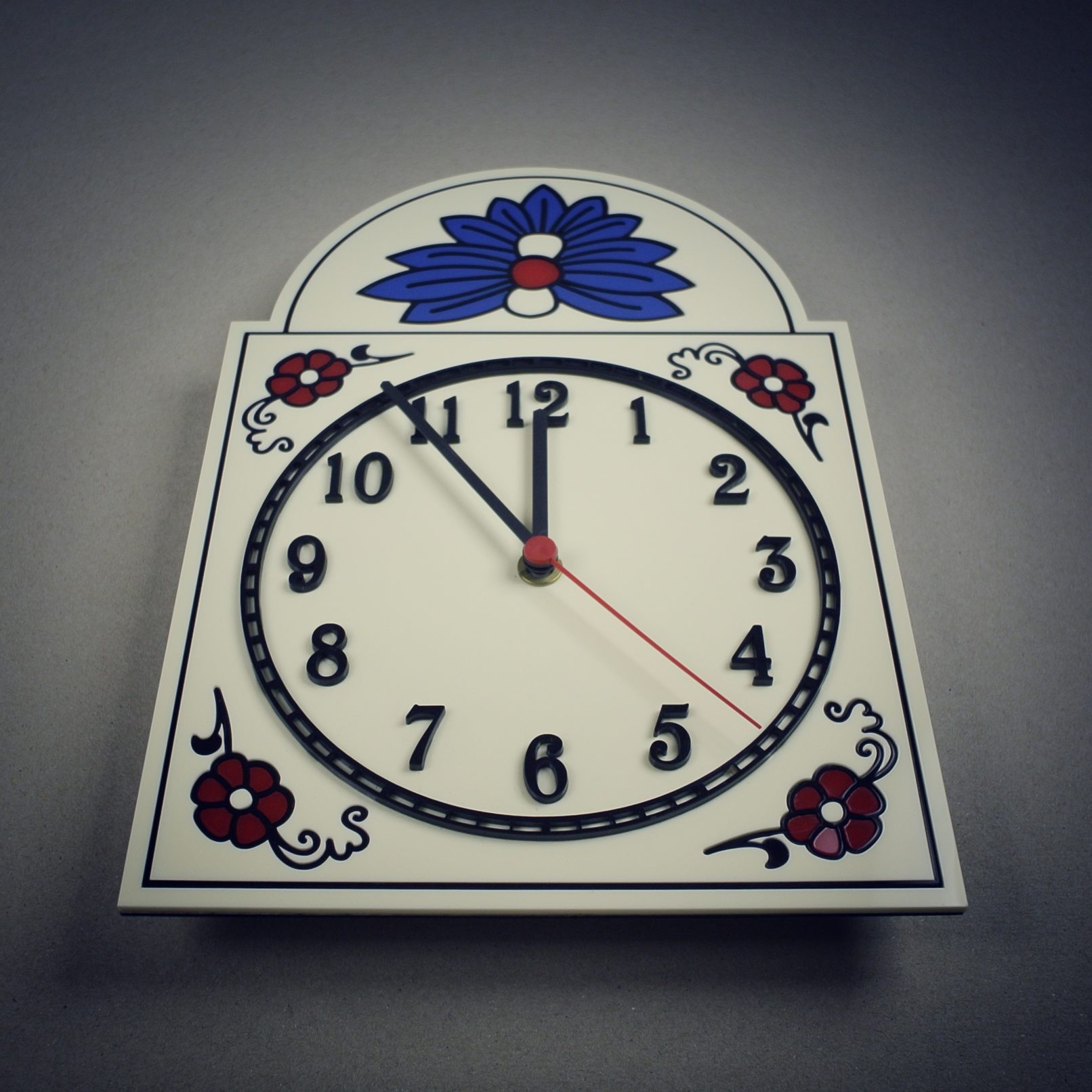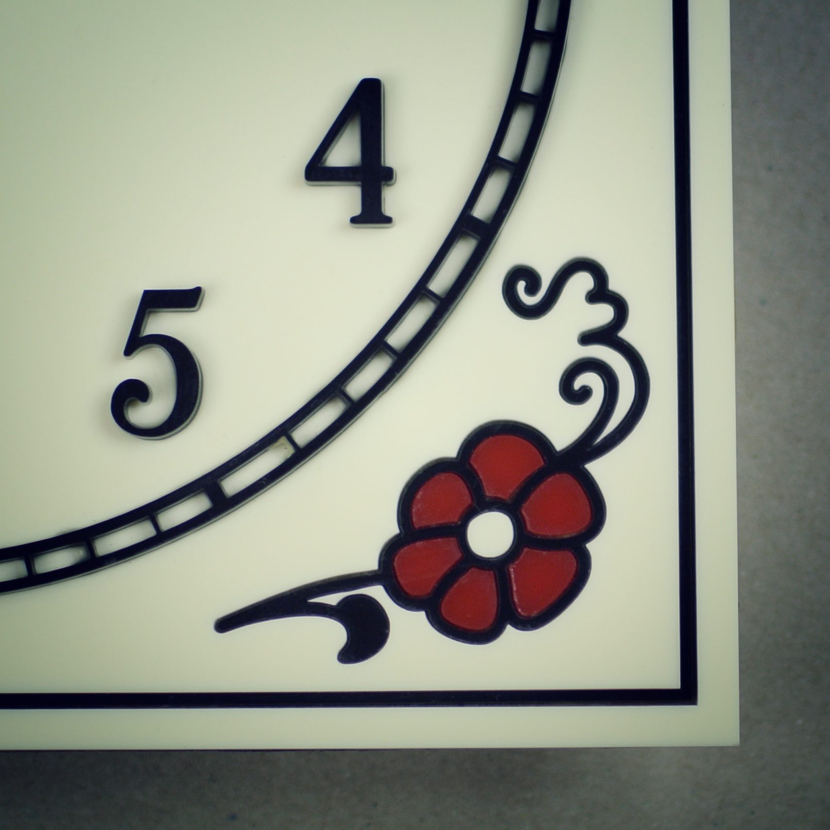 Intarzované hodiny z plexiskla a dřevěné překližky, gravírované logo, hodinový strojek.