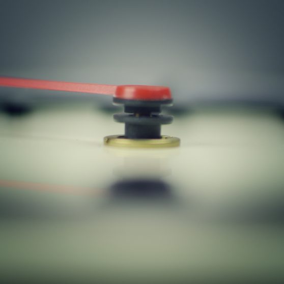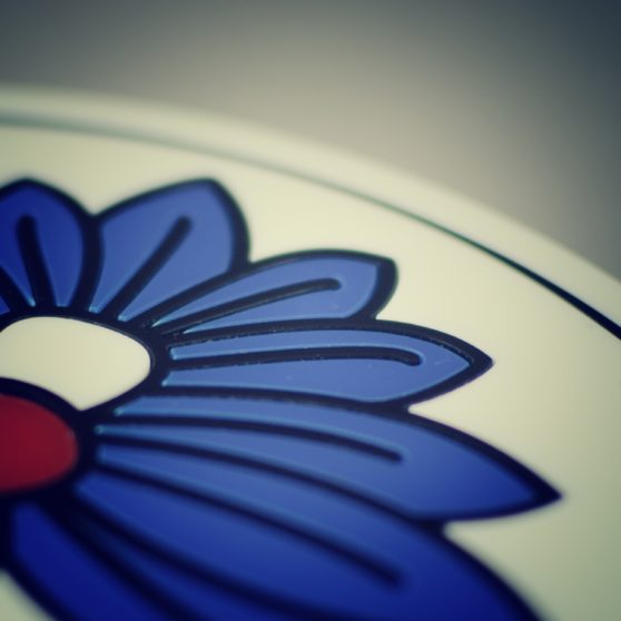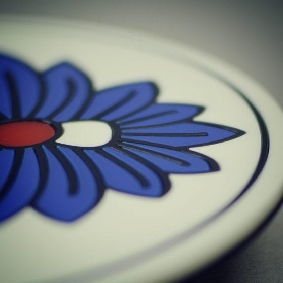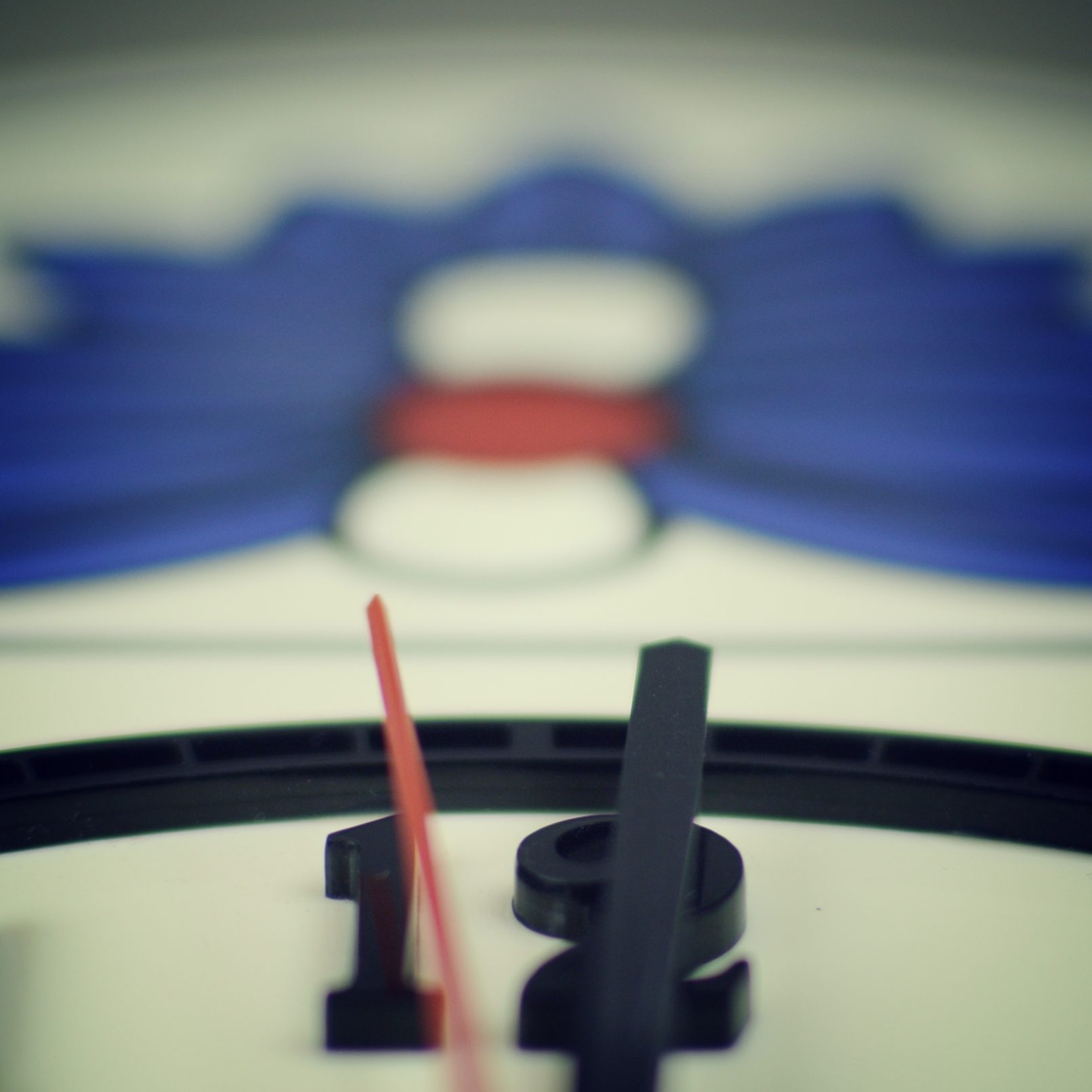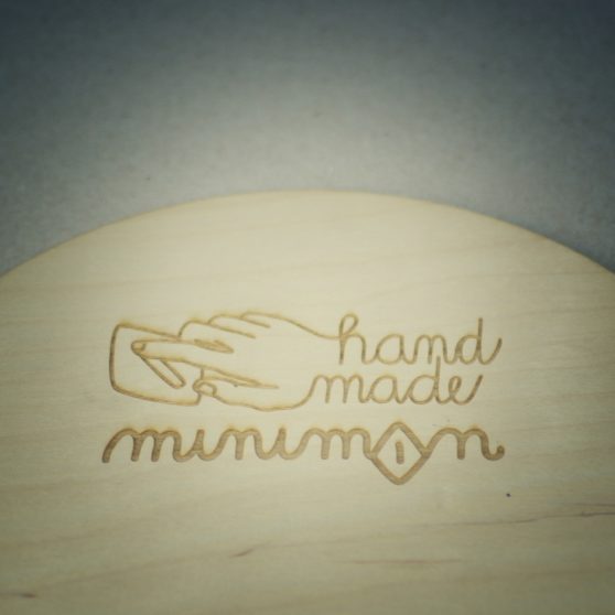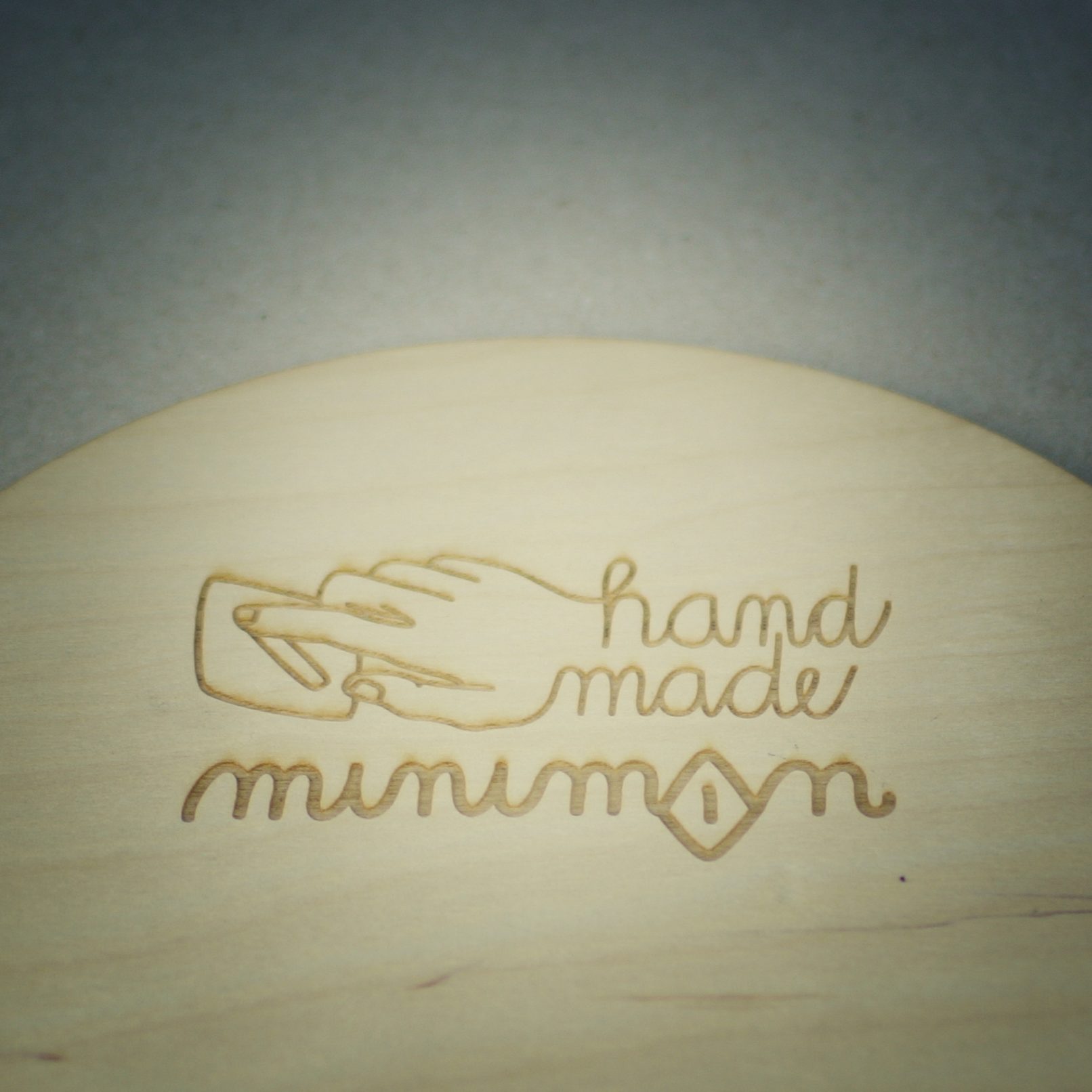 Intarzované hodiny z plexiskla a dřevěné překližky, gravírované logo, hodinový strojek.