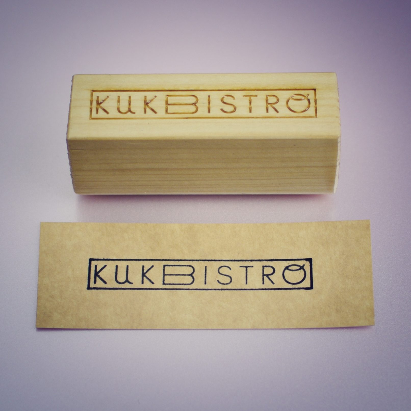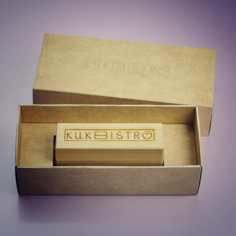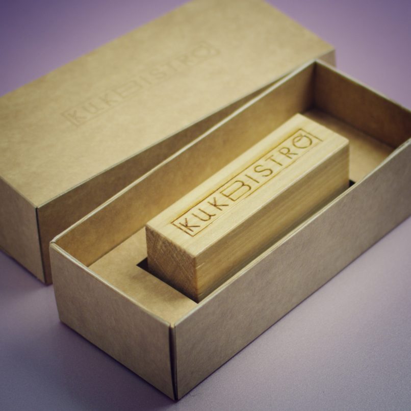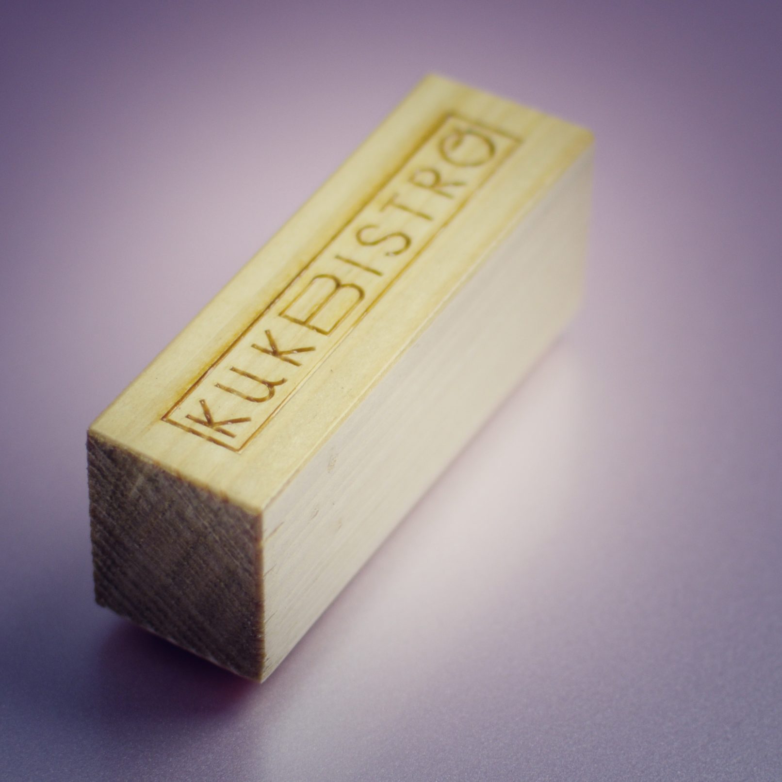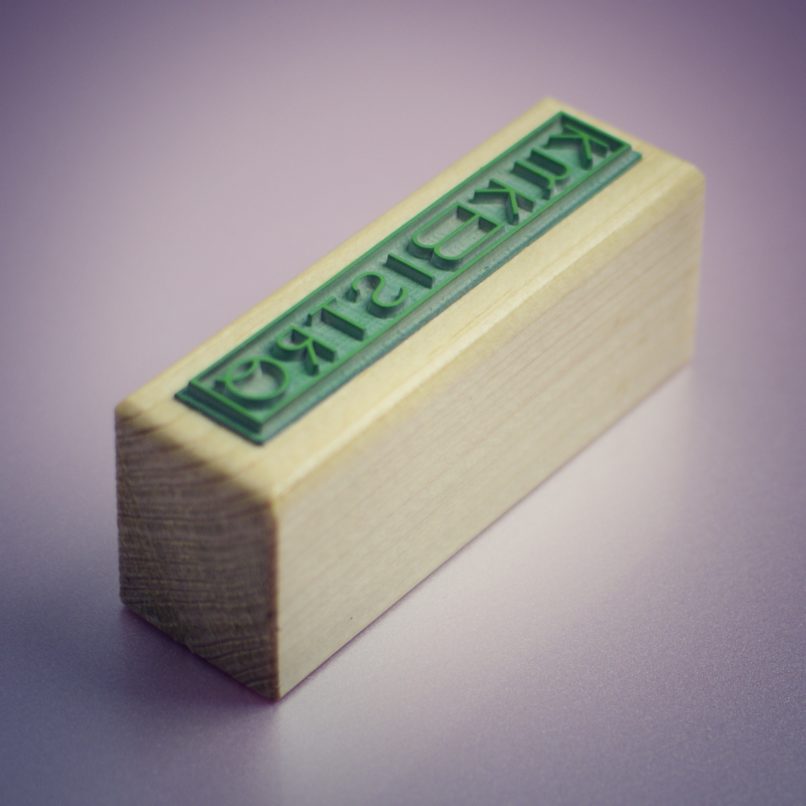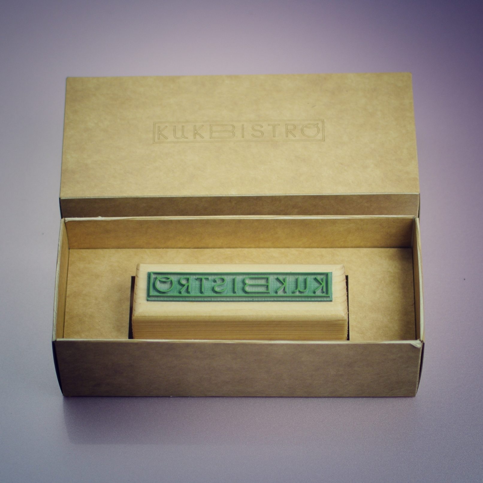 Laserované razítko, razítkovací guma, obroušený dřevěný špalíček, krabička.