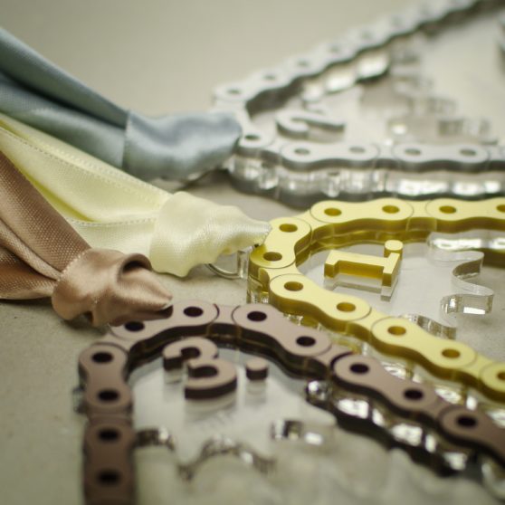 Laserované a gravírované plexisklo, lepené. Na stuze.