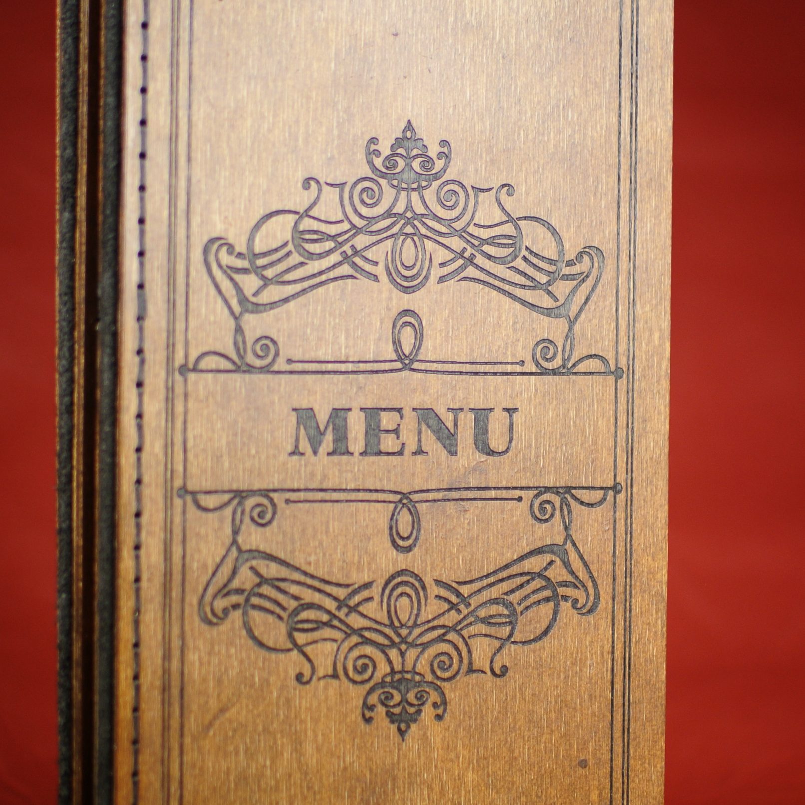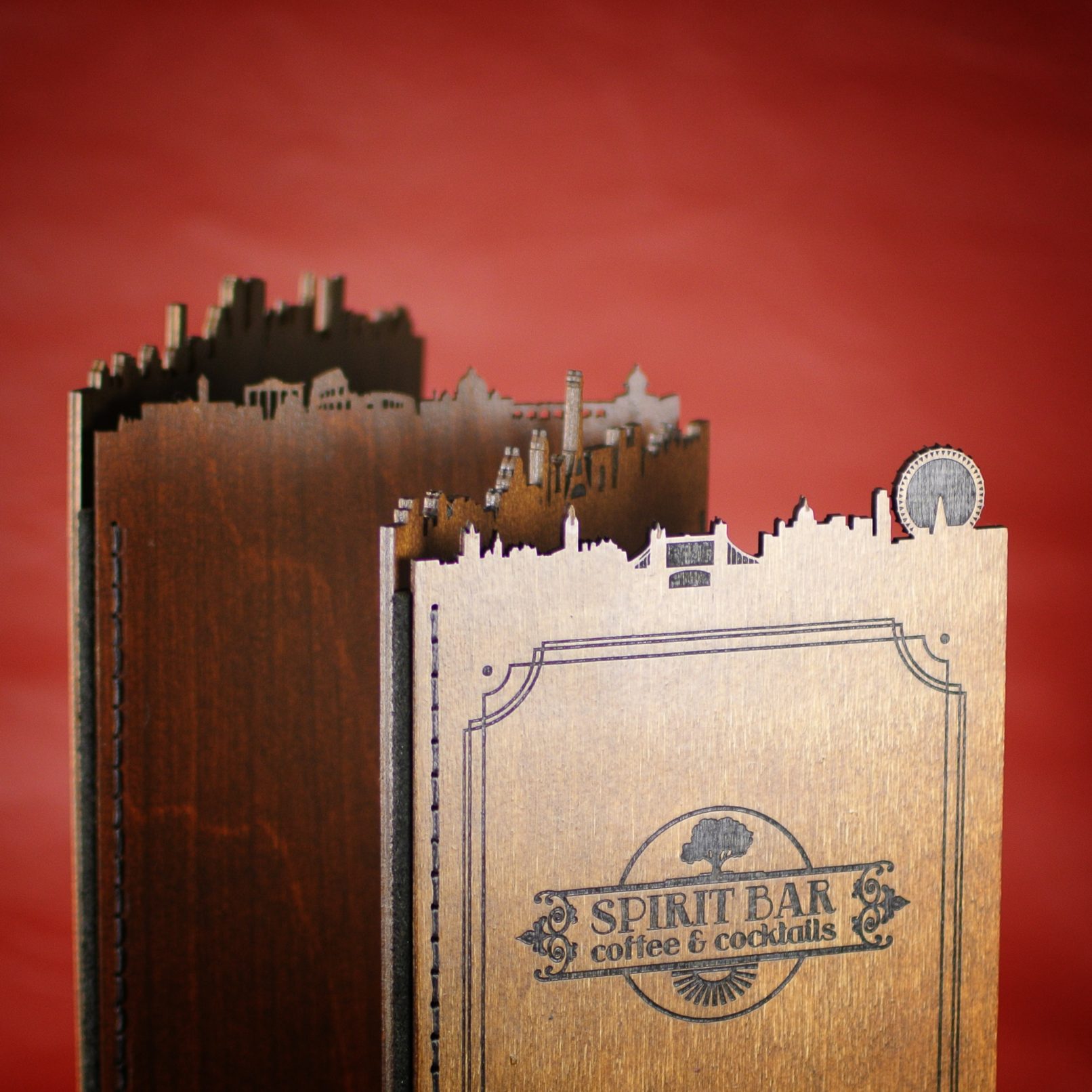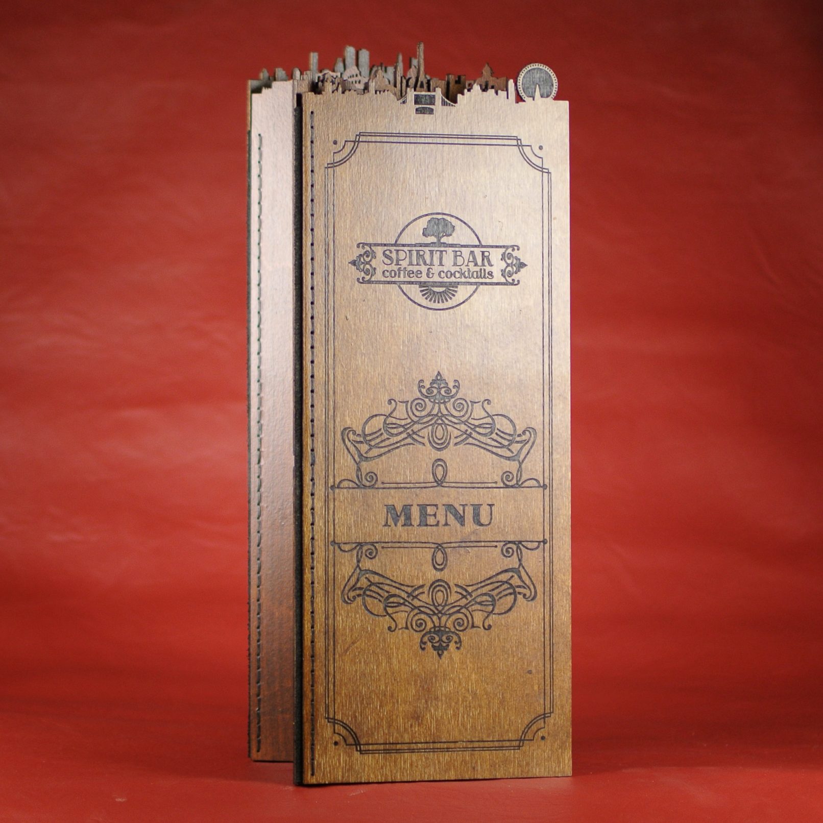 Rozkládací MENU pro Spirit bar v Brně. Laserovaný, gravírovaný, mořený, lakovaný, šité panty z kůže.
