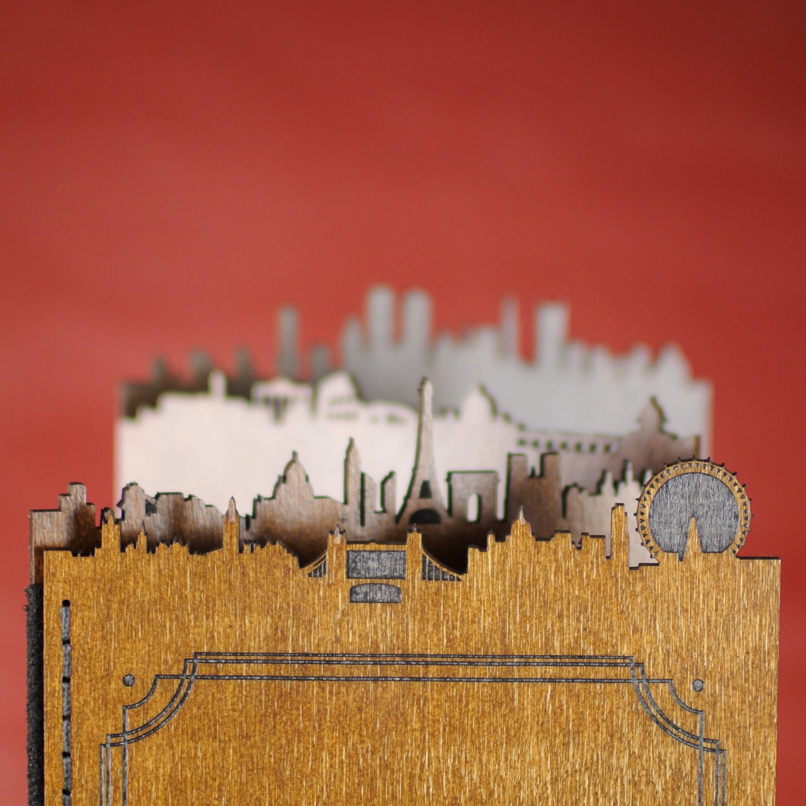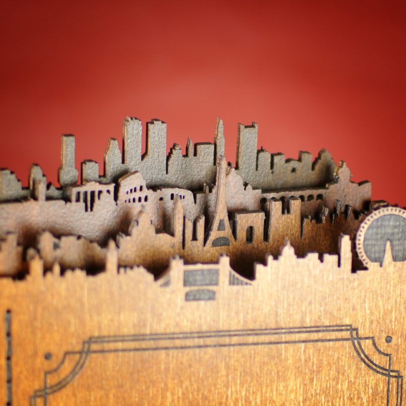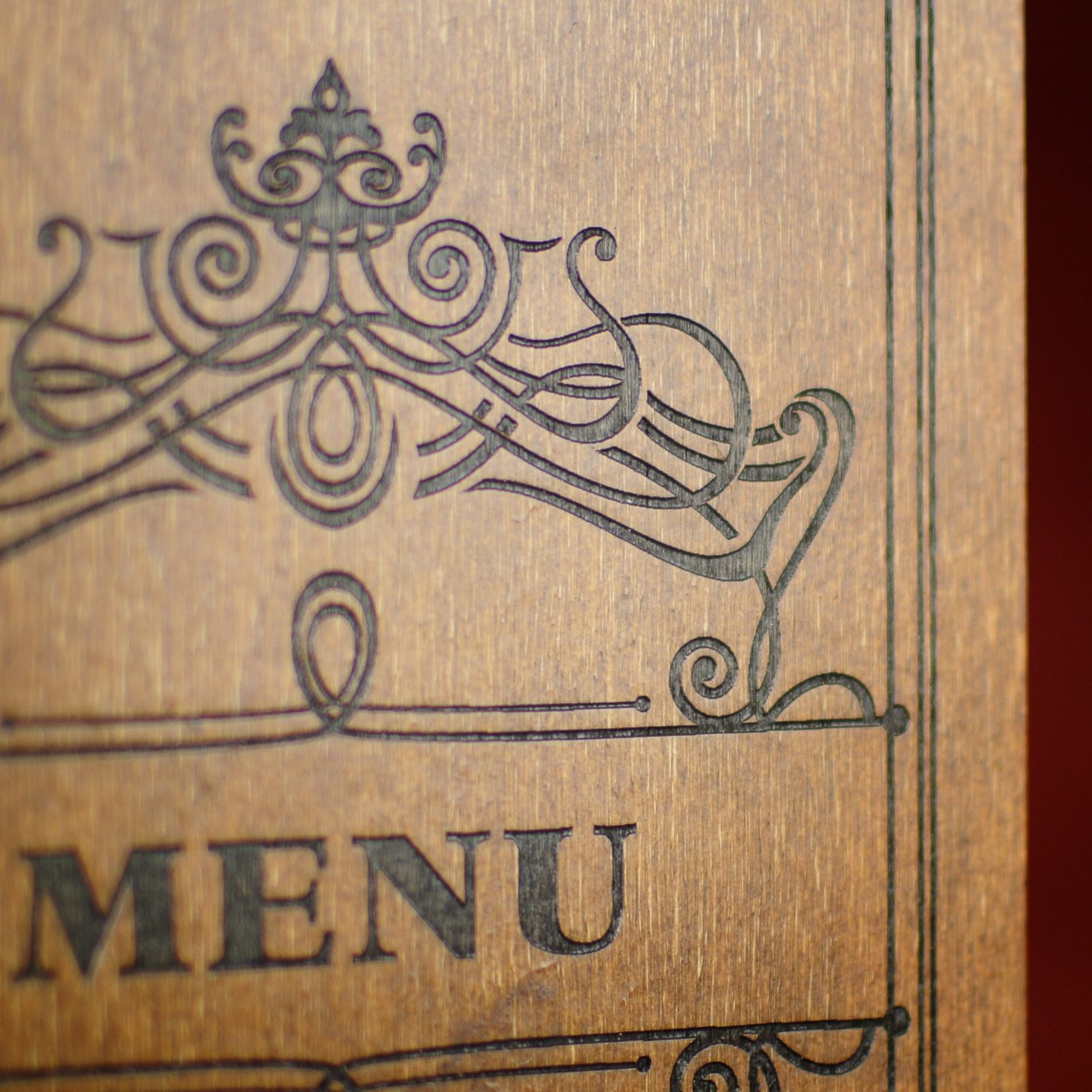 Rozkládací MENU pro Spirit bar v Brně. Laserovaný, gravírovaný, mořený, lakovaný, šité panty z kůže.