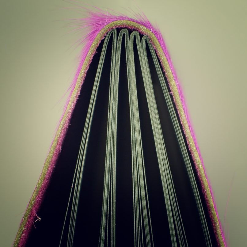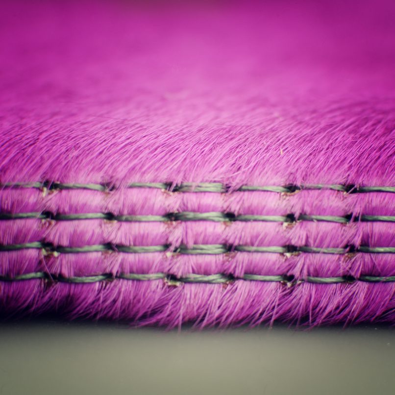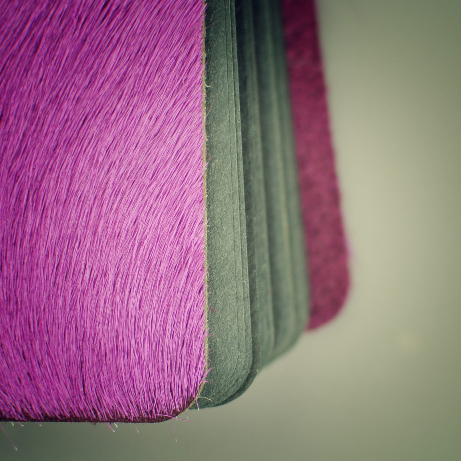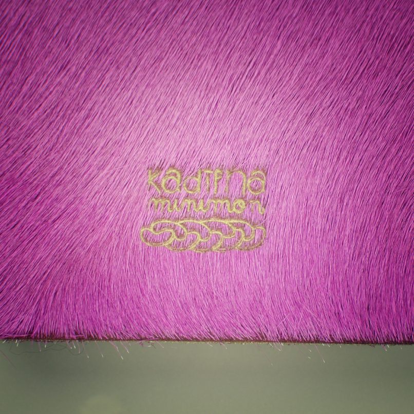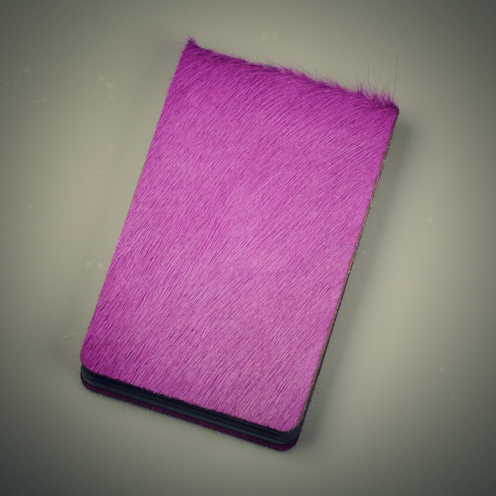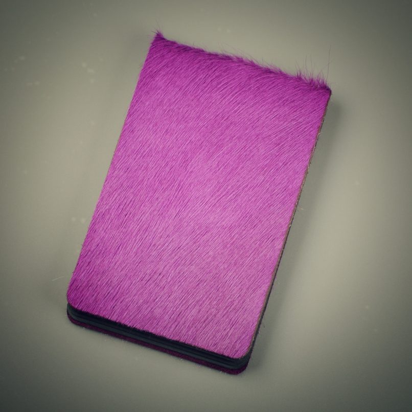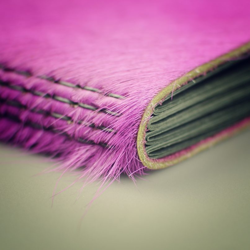 Blok se 40ti černými vnitřními listy, obal z hovězí kůže s chlupem, barveným do růžova. Ruční vazba, gravírováno.